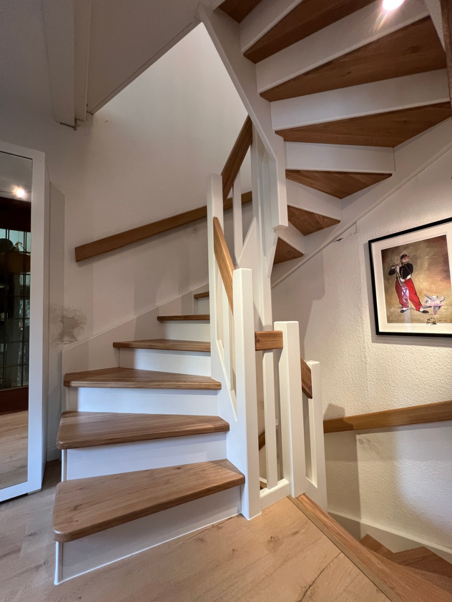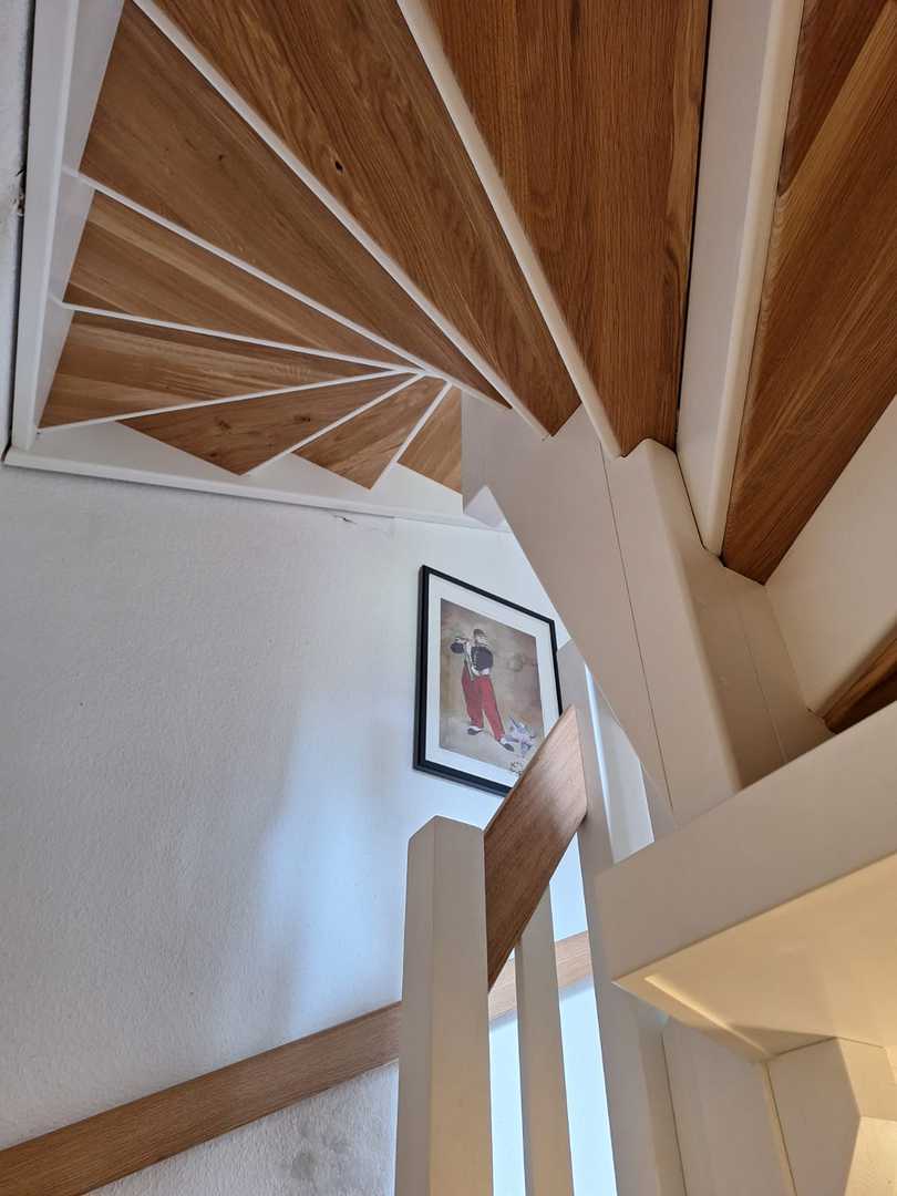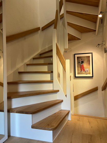 Die alten durchgetretenen Stufen wurden an den Vorderkanten bis zu den Stosstritten abgefräst und es wurden neue Belagsstufen in Eiche mit vorderen Aufkantungen gefertigt und montiert. Stosstritte in weiss lackiert wurden vor den alten Stosstritten vorgesetzt.